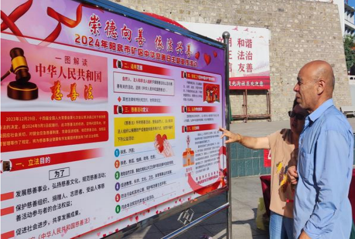 2024年9月5日是我國第九個“中華慈善日”, 也是修改后的《中華人民共和國慈善法》正式施行之日。為深入學習貫徹習近平總書記關于慈善工作的重要指示批示精神和黨的二十屆三中全會精神,廣泛動員社會公眾參與慈善事業,營造崇德向善慈善氛圍,促進慈善事業高質量發展,陽泉市礦區開展以“崇德向善 依法興善”為主題的 “中華慈善日”系列宣傳活動。