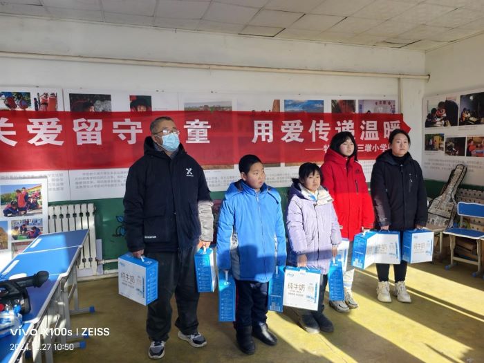 在元旦佳節即將來臨之際,大同市留守兒童救助協會攜手大同牧同乳業,帶著滿滿的愛心與關懷,走進了新榮區花園屯鎮三墩小學,為該校10名留守、困境兒童送去了節日的溫暖與祝福。